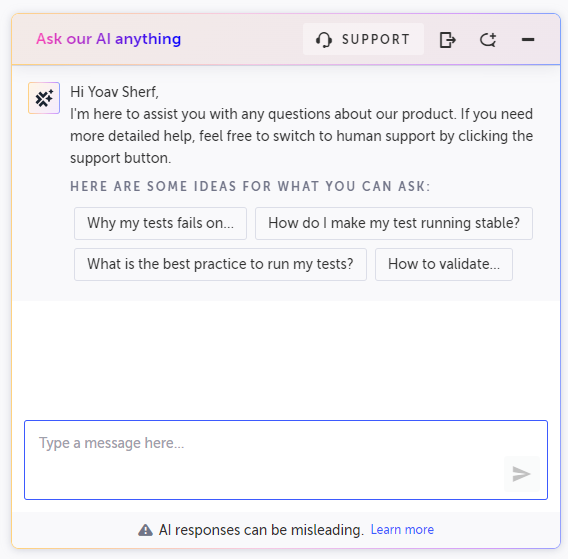 Need help with Testim software? Whether it's something basic, such as instructions on how to validate tests, or a more complex query, such as tips on how to stabilize your test runs, you can ask the Testim Copilot Help Assistant.