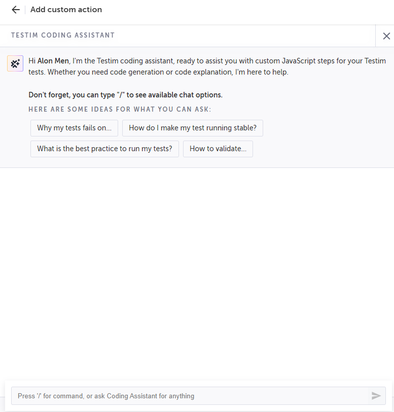 Need help writing, understanding, or fixing the JavaScript code in your tests? Use the Testim Copilot Coding Assistant to get help on any test steps that use custom JavaScript code.